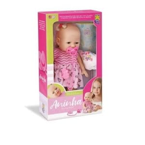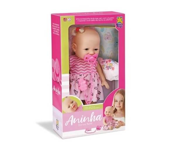 A boneca aninha dorme bebê da divertoys é ideal para meninas acima de 3 anos. Quando voce deita a boneca, ela fecha os olhinhos! Acompanha chupeta e fraldinha.