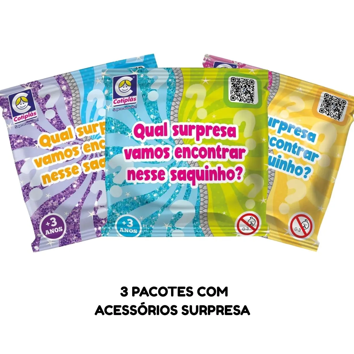 Contém 1 boneca e 3 saquinhos com surpresas de acessórios de bonecas.