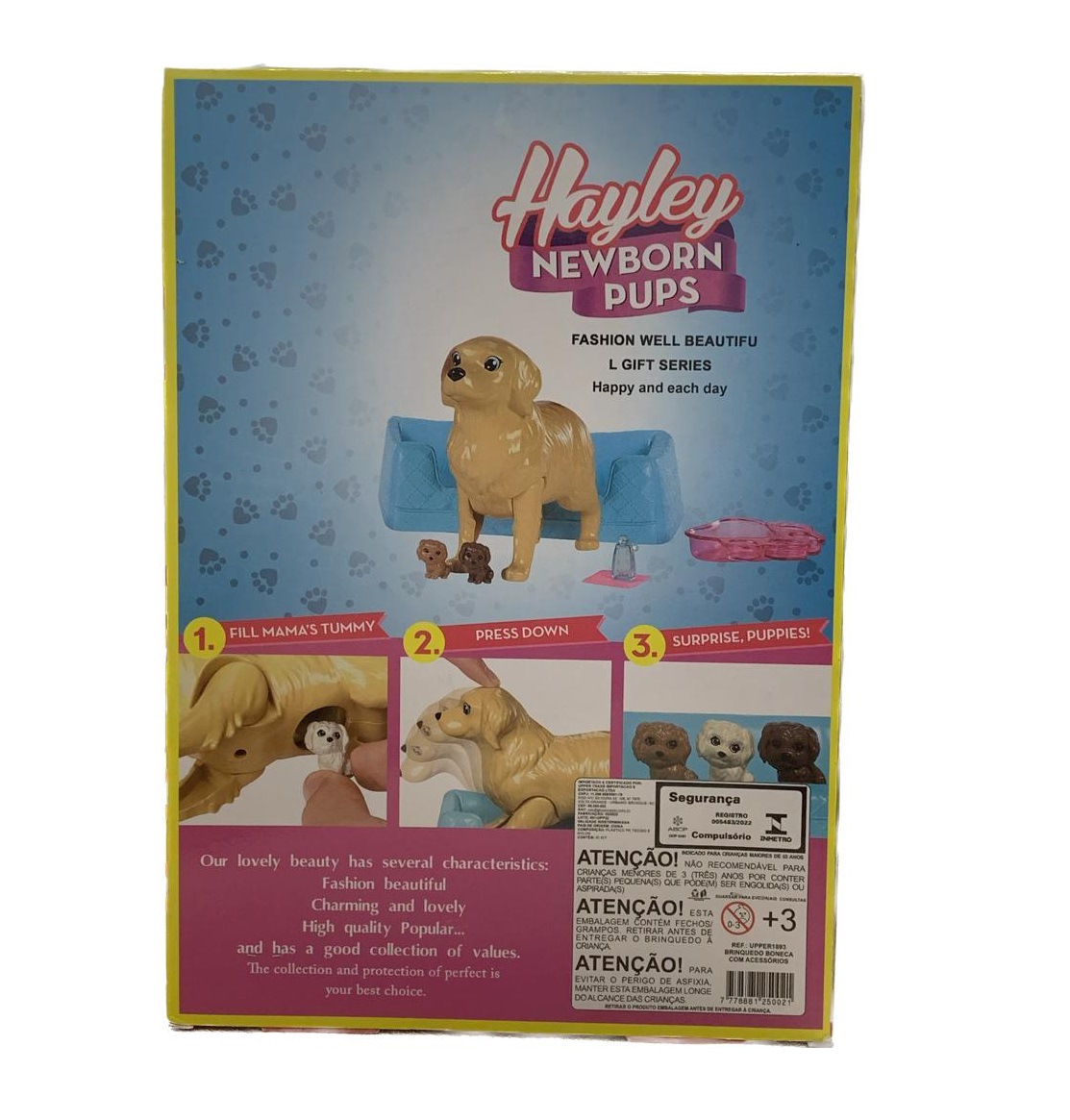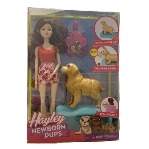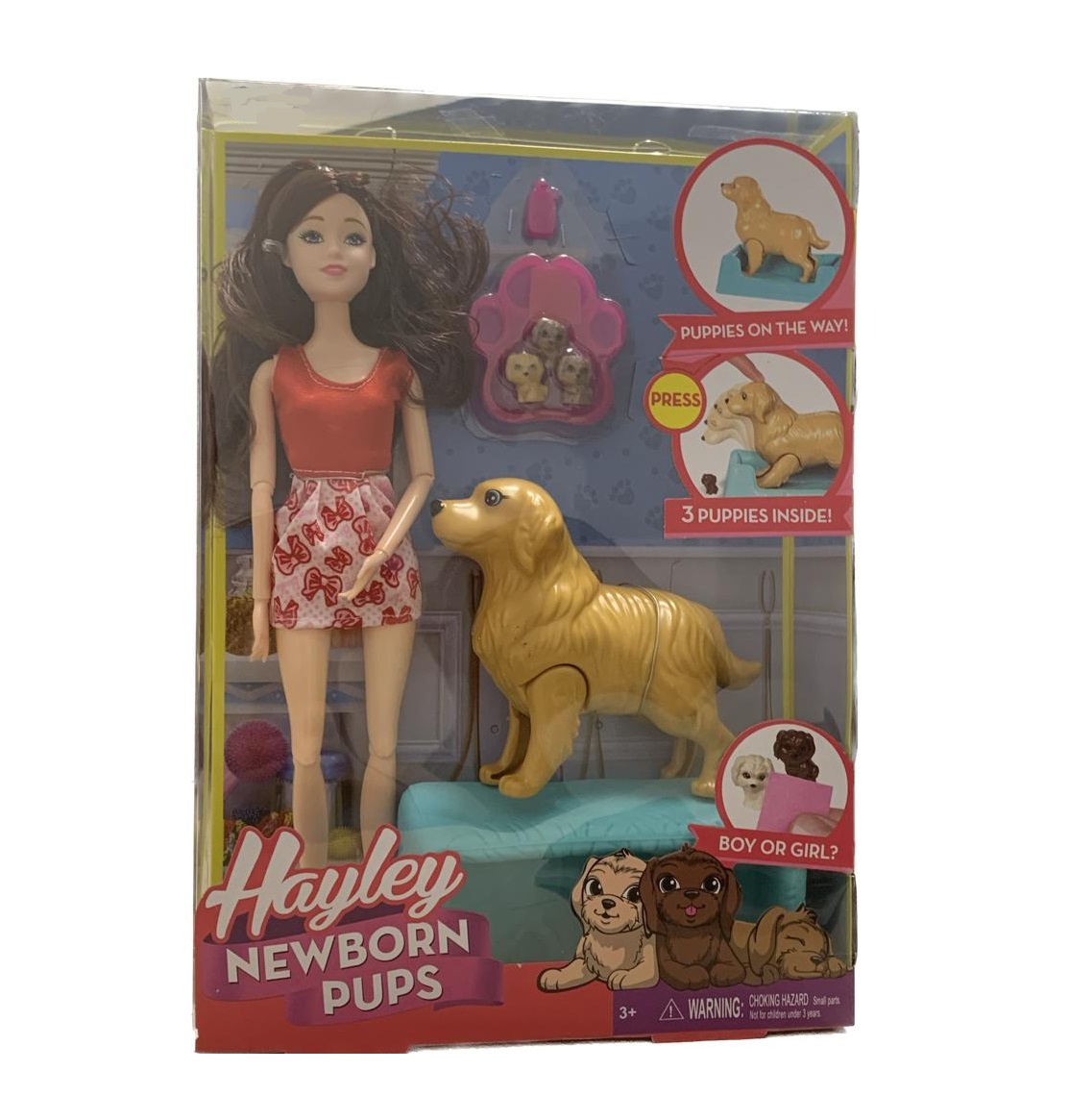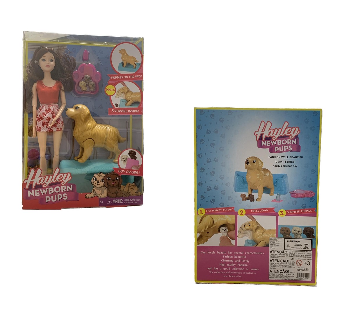 A cachorrinha da Hayley está gravida, com sua filha ajude ela a dar à luz, apenas pressione 2 vezes suas cabeças para baixo e pronto acaba de nascer 3 lindos filhotes! Passe uma toalha umedecida, com agua fria nos recém-nascidos para ver seus olhos abrirem. Com articulações nas pernas, para auxiliar sua cachorrinha a dar à luz, inclui também banheira que pode ser utilizada como caminha para os cachorrinhos.