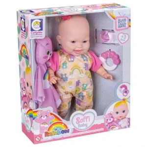 A Boneca Soffi Baby Rainbow, da Cotiplás chegou para a diversão da criançada, e a brincadeira será completa! A boneca é muito linda e tem o corpinho super macio, acompanha um macacãozinho lindo e colorido de ursinhos, uma chupeta, um mordedor e uma naninha muito fofinha, para acompanhar a boneca durante o seu soninho, o tamanho aproximado da boneca é de 34 cm O cuidado com as bonecas, ativará as lembranças das crianças com relação as mamães, proporcionando momentos de muito amor e diversão para todos