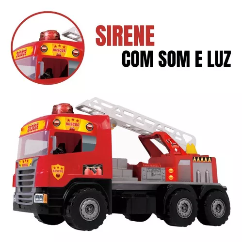 Impossível não se apaixonar por ele! Você vai se divertir com o esse super caminhão bombeiro. Ele é completo como um caminhão de verdade, sua sirene com sons e luzes, sua escada extensível com alavanca dará realidade à brincadeira! Acompanha um lindo capacete. Você vai se encantar com ele, reúna seus amiguinhos e entre nessa aventura!