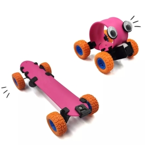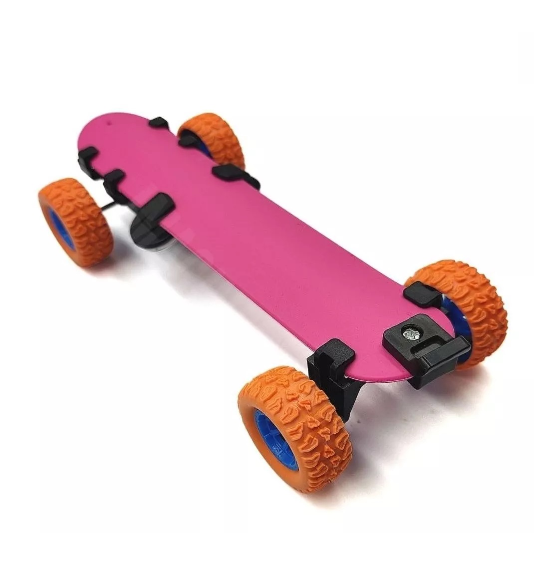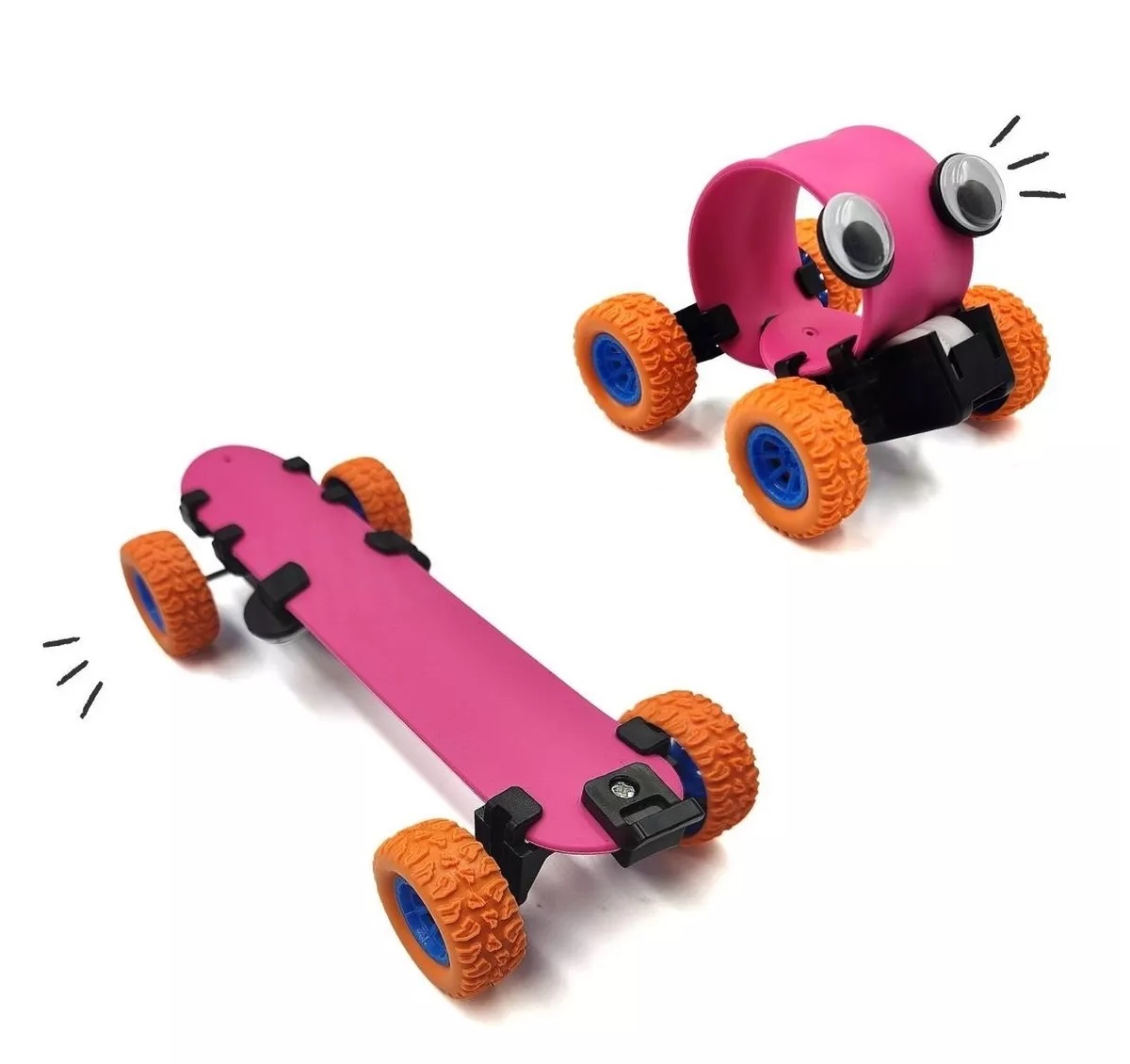 Esse divertido bracelete vira um carrinho de fricção e um skate longboard com cores fortes e olhinhos divertidos para estimular a criatividade.