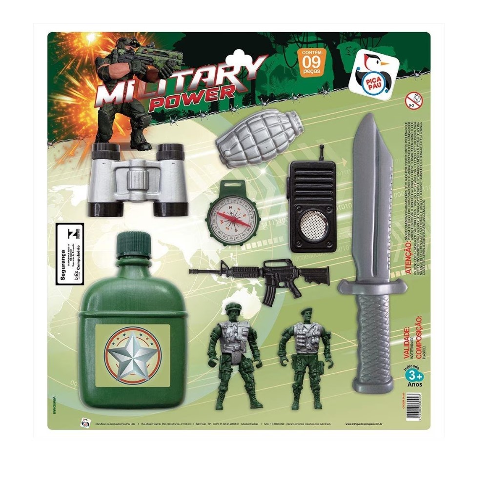 Military Power O Kit Military Power é um Kit recheado de acessórios como rádio , boneco , binóculo entre outros , este kit chegou para divertir e aventurar a garotada. Com ele, brincar de faz de conta ficou muito mais legal , divertido e realista !