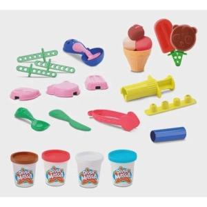 – Contém: 3 forminhas de formato de sorvete, 3 palitinhos, casquinha, seringa modeladora com bico, pegador, faca sem corte, rolinho e colher