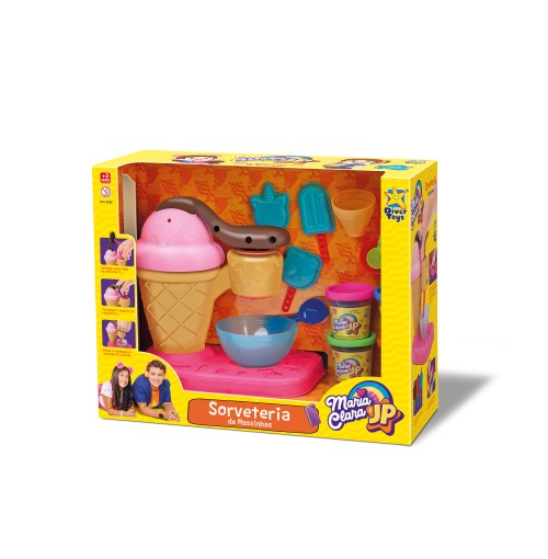 Na Sorveteira de Massa Maria Clara & JP você prepara vários sorvetes lúdicos. Vem também com várias forminhas para fazer picolés e confeitos. Acompanham 4 potinhos de massa de modelar coloridas.